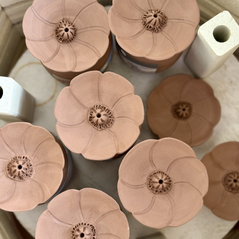 I mixed the glaze until it was the perfect consistency, thick like cream. I dipped each holder quickly and smoothly, pulling it out with a decisive lift, letting the excess drip away. The glaze felt cold and chalky, turning the piece a dull, dusty pink. I left the inner pistil bare, knowing the natural colour of the red clay would shift to a toasted tan in the heat, creating a perfect contrast to the bright red petals.
